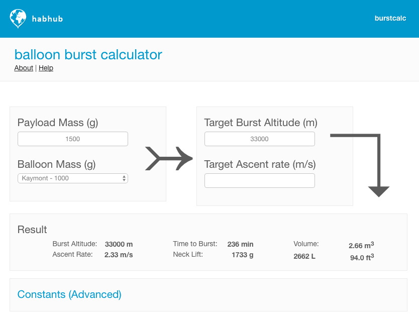 Screenshot of HABHUB’s Balloon Burst Calculator