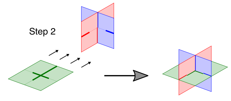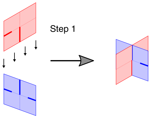 To start, get three square pieces of cardboard with side lengths of 6"-12" (you pick the size but all pieces must be the same size). Cut slots in the cardboard in the locations shown below. Make sure that the slots you cut are only as wide as the cardboard thickness plus the thickness of the aluminum tape (details below), or a little bit less – it is better to have it snug so the friction will work with you when you are putting the pieces in place.