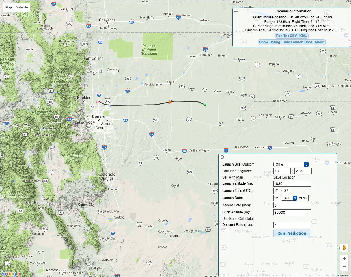 Please see the great prediction summary page by the Global Space Balloon Challenge if you have other requirements or curiosities that are not satisfied here. The site states, “some prediction sites online offer real-time flight predictions. This allows a team to chase the landing site and not the balloon.” This sounds great, but it’s unclear which sites allow you to do this. You may also enjoy exporting the prediction results to a KML file, which can then be viewed with Google Earth.