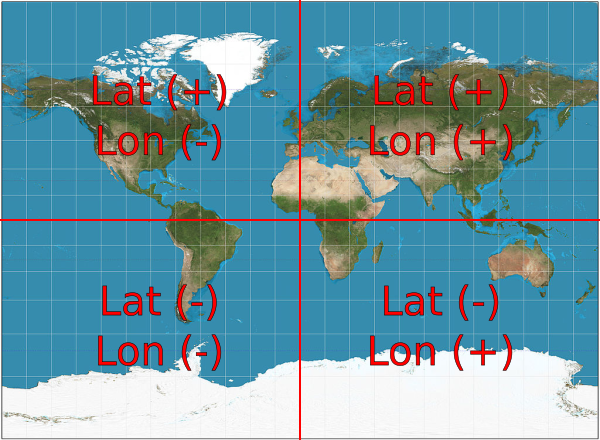 Clarification on the correct signs for latitude and longitude for each hemisphere. Modification to Miller Projection on Wikipedia by Strebe (Own work) [CC BY-SA 3.0], via Wikimedia Commons